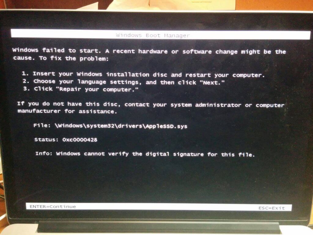 Apple üzerinde Windows işletim sistemi kullanmak isteyenlerin en kolay çözümü Bootcamp yazılımı ile Windows yüklemek sistemlerine. Bu yüklemeler genellikle sorunsuz geçse de bazen ufak sorunlarla karşılaşılabiliyor. Bunlardan bir tanesi de AppleSSD Driver’ınını Dijital imzasının Windows tarafından geçersiz görüldüğü durum. Bu aşamada ekranda alınan mesaj ise aşağıdaki gibi oluyor;