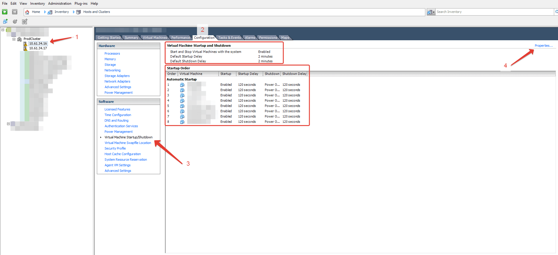 Host’u seçtikten sonra Configuration => Software Tab => Virtual Machine Startup / Shutdown adımlarını izliyoruz ve özelliği düzenlemek içinde sağ üstte bulunan Properties kısmını seçerek devam ediyoruz.