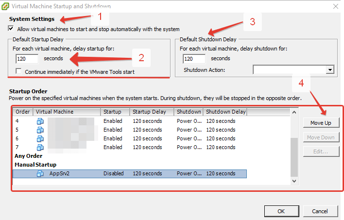 Buradaki önemli olaylardan biri de sanal makinelerin açılma sıralaması ve zamanlaması. Bazı makineleri diğerlerinden önce açmak isteyebilirsiniz mesela DC (Domain Controller) gibi makineler. O açılmadan ve servisleri başlamadan diğer makinelerin açılması sıkıntı yaratabilir. Bu yüzden de makinelere açılması için bir sıralama ve iki açılma işlemi arasında geçen zamanı belirleyebilirsiniz. Benim yapılandırmamda 120 sn verdim aralığı. İlk makine açıldıktan sonra diğer makinenin açılma işlemi için 120 sn yani 2 dk bekleyecek ve sonrasında diğerine Start verecek. Bunun bir artısı da bütün makineler açılırken Host’a yüklenmiyor.